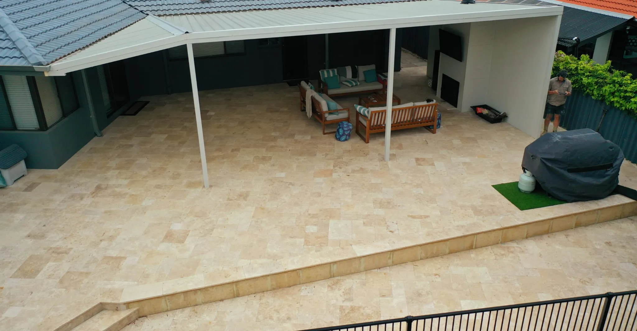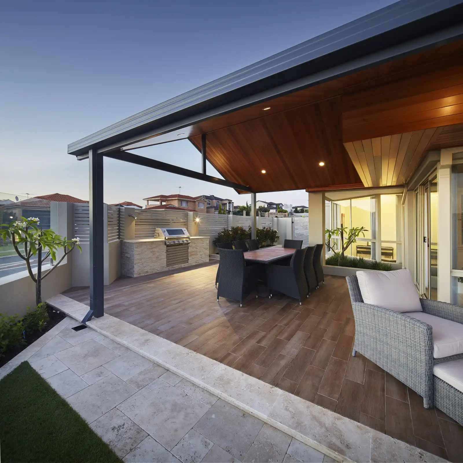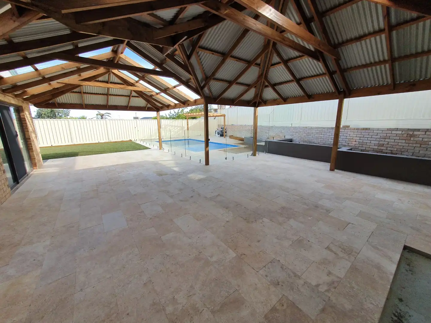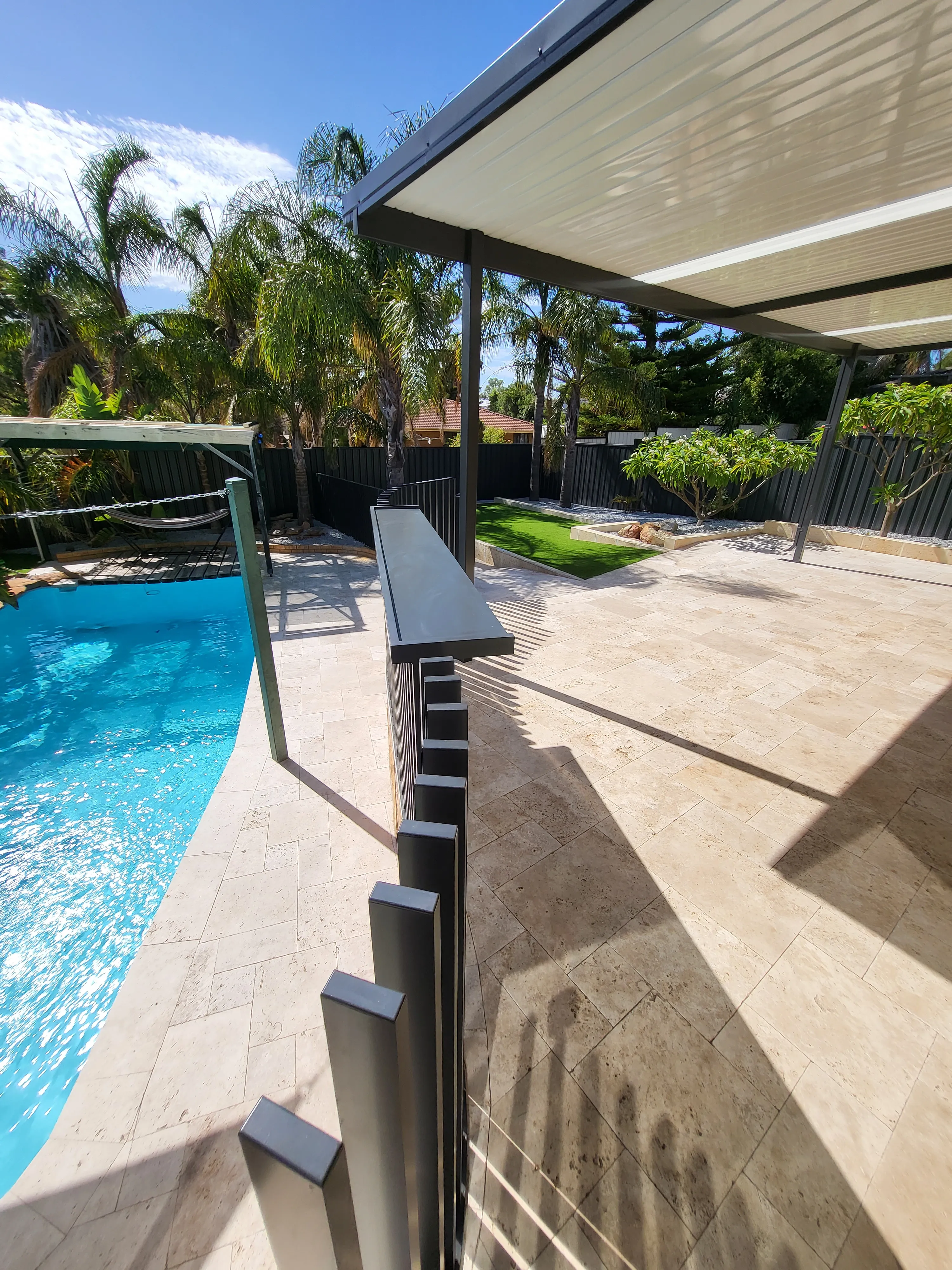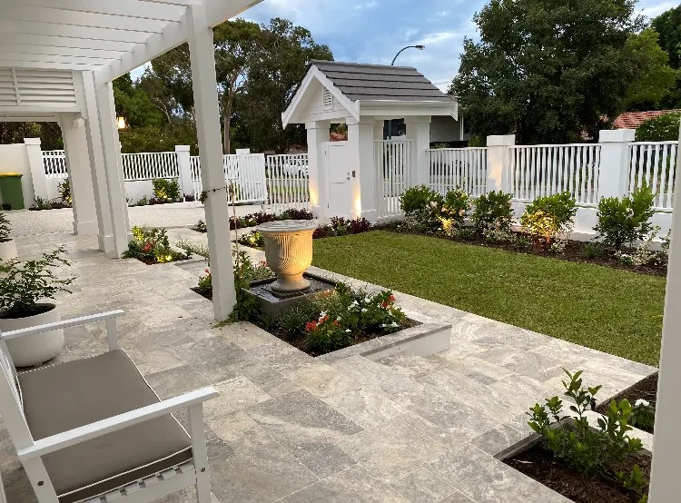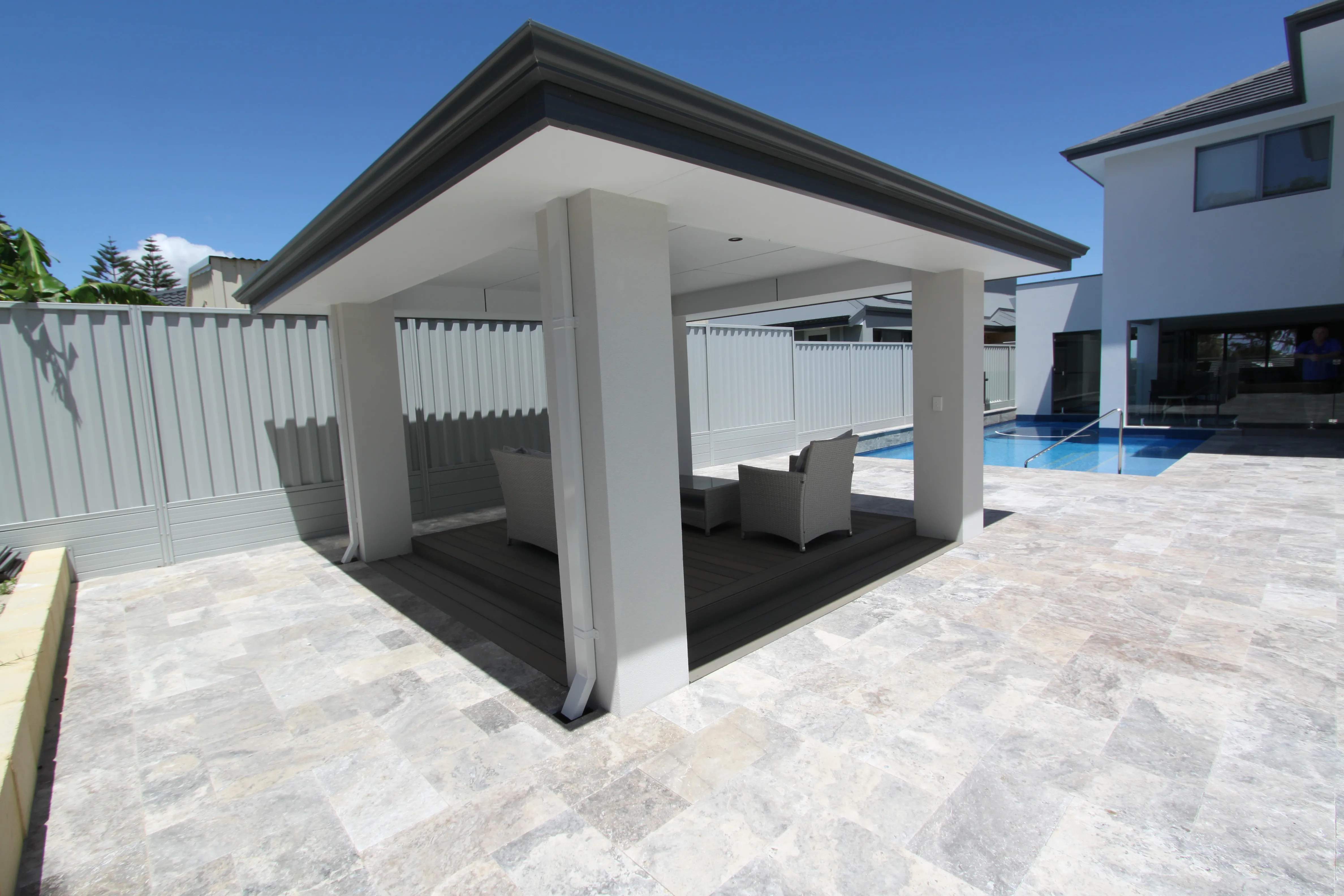 Jarrahwash and Roma Travertine Alfresco Paving with White Quartz Wall Cladding