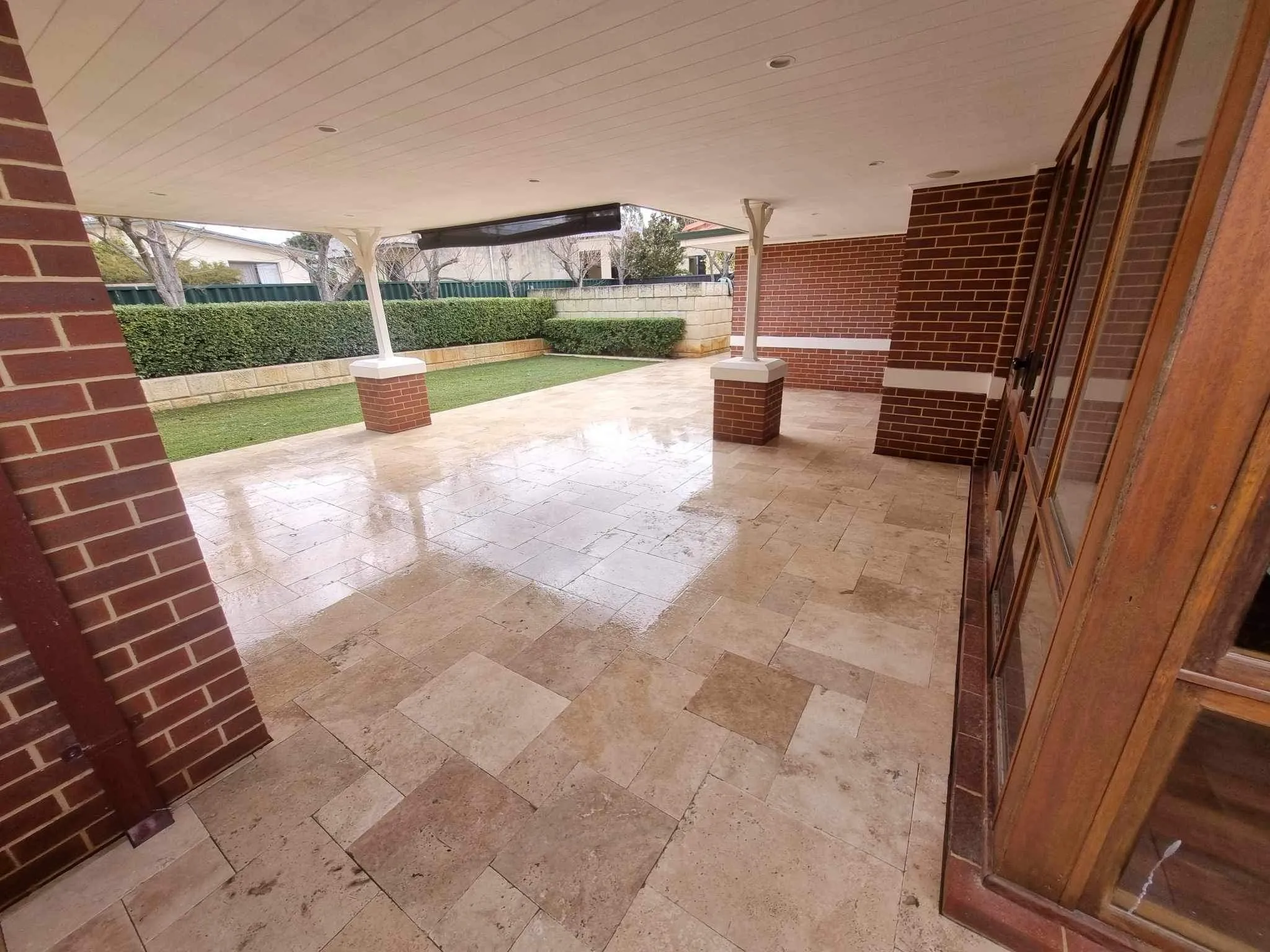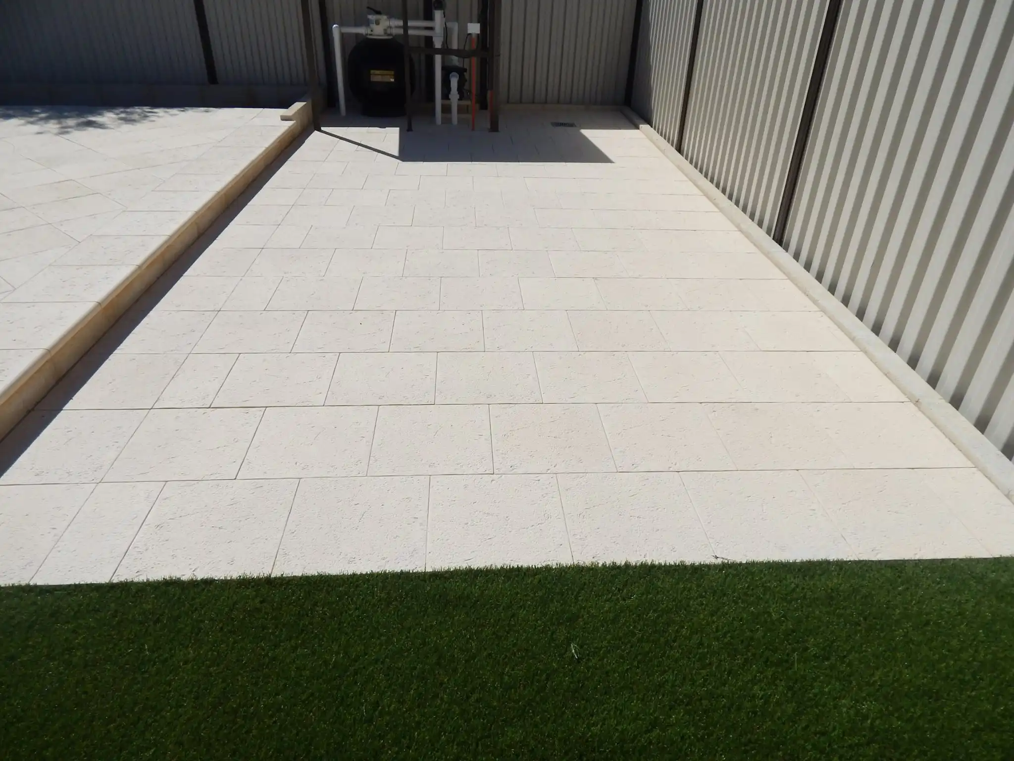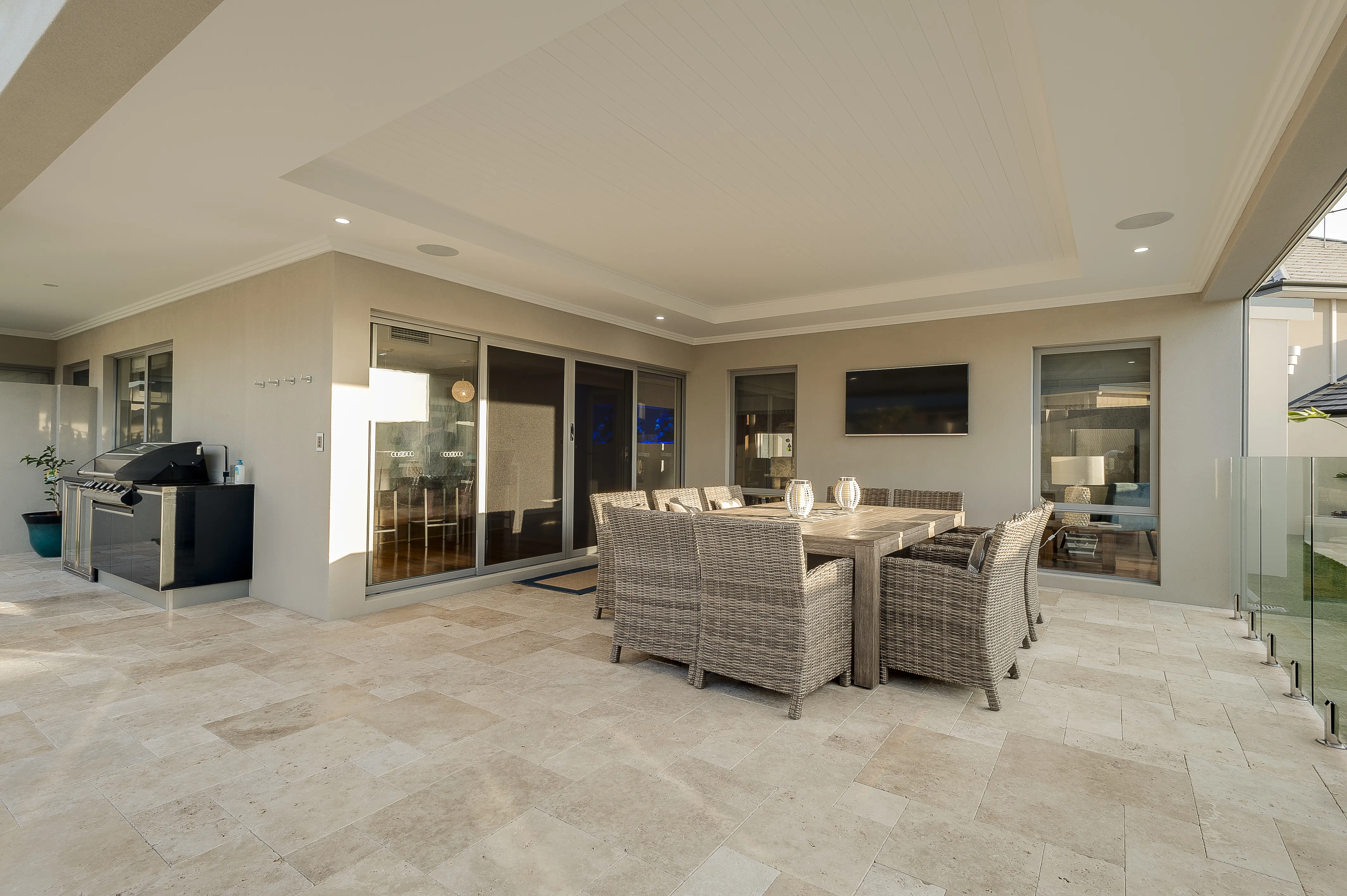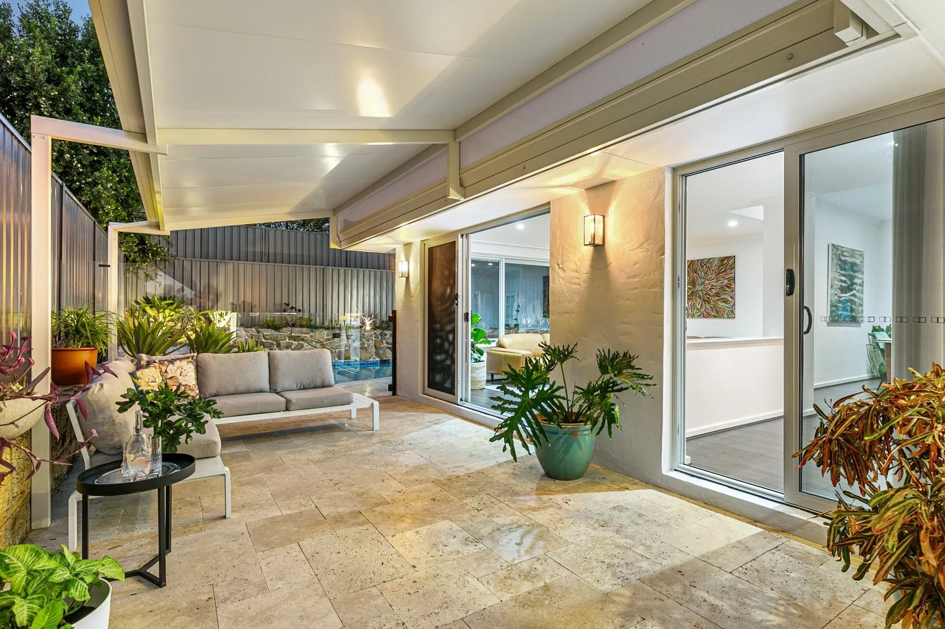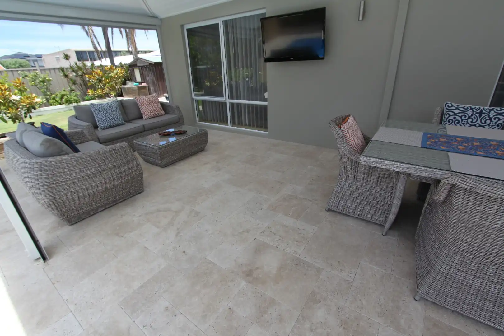 Jarrahwash and Roma Travertine Alfresco Paving with White Quartz Wall Cladding