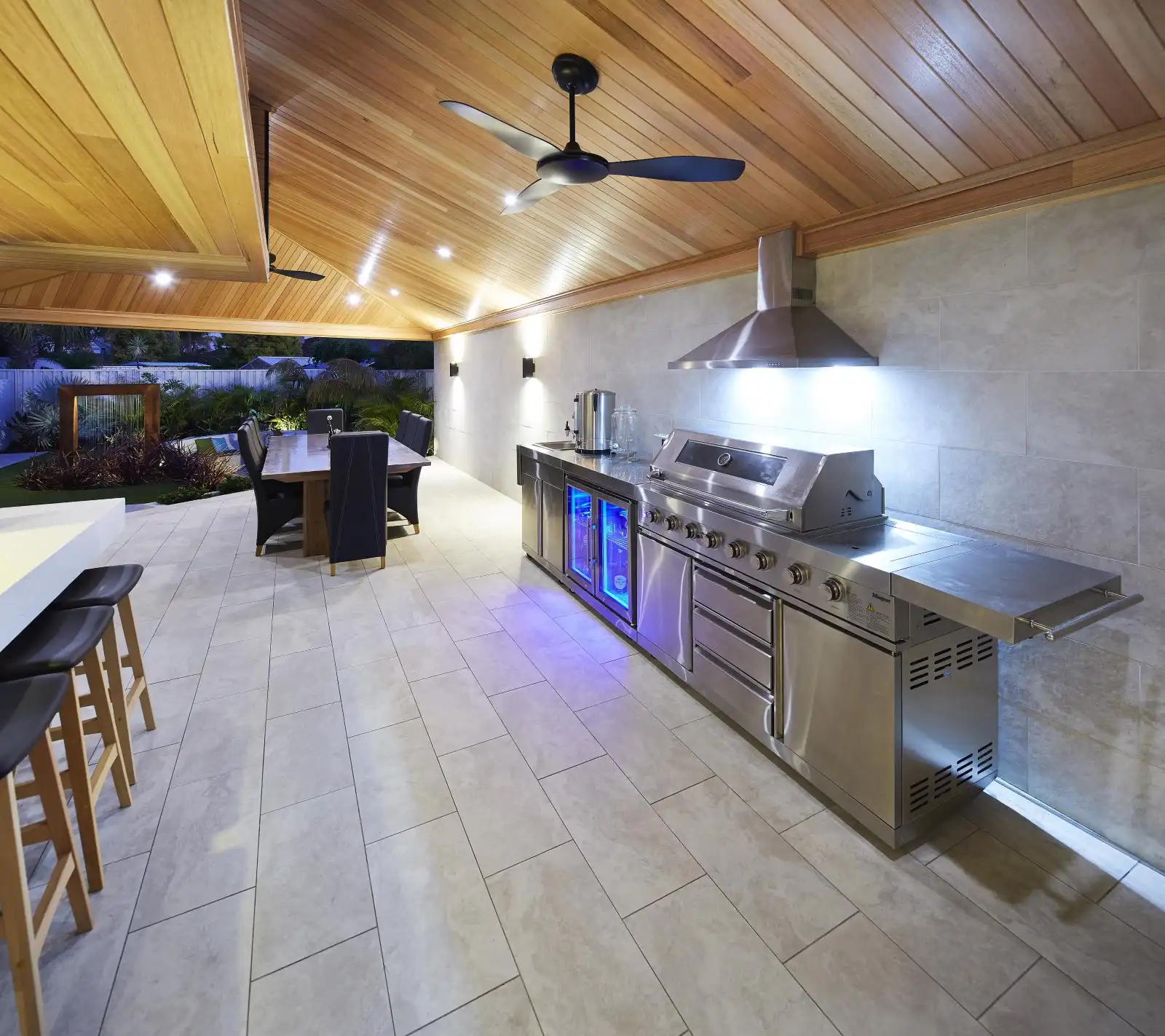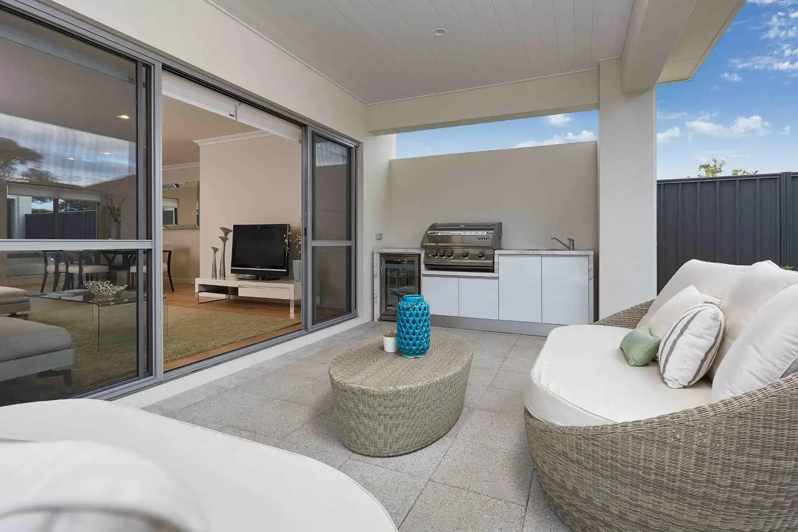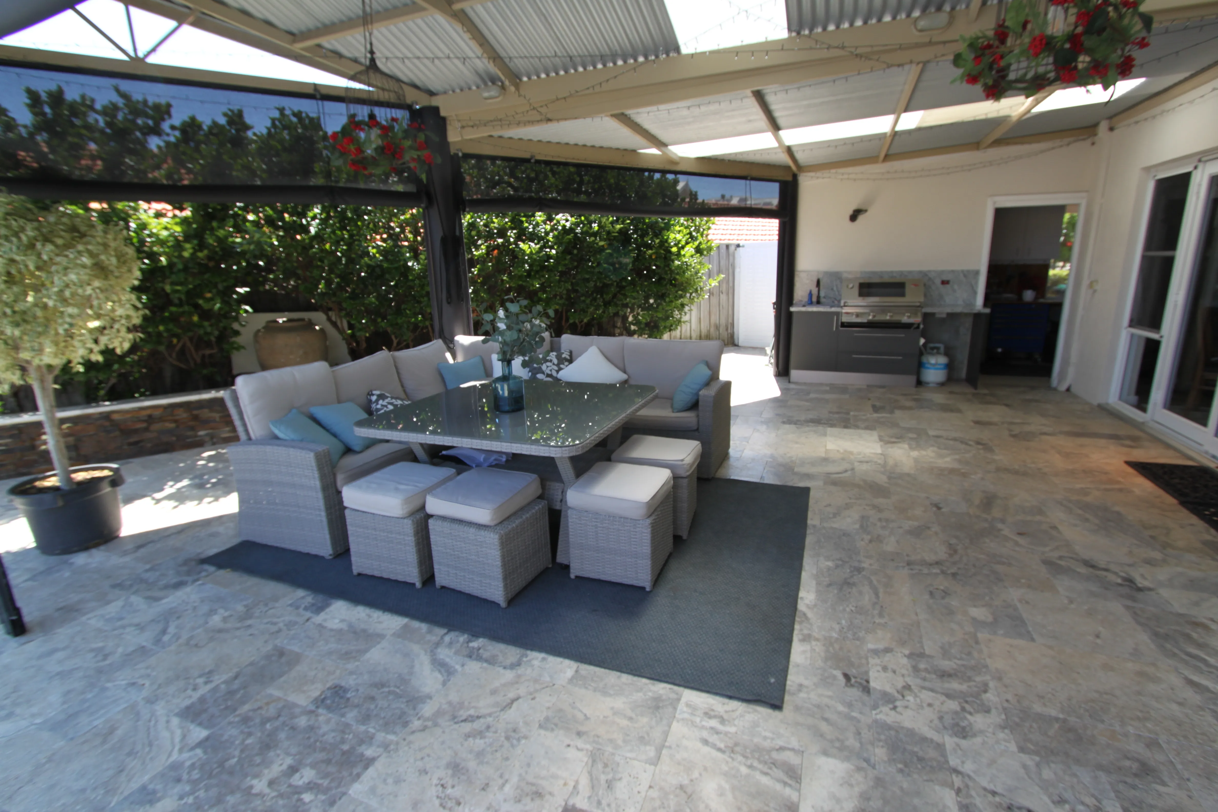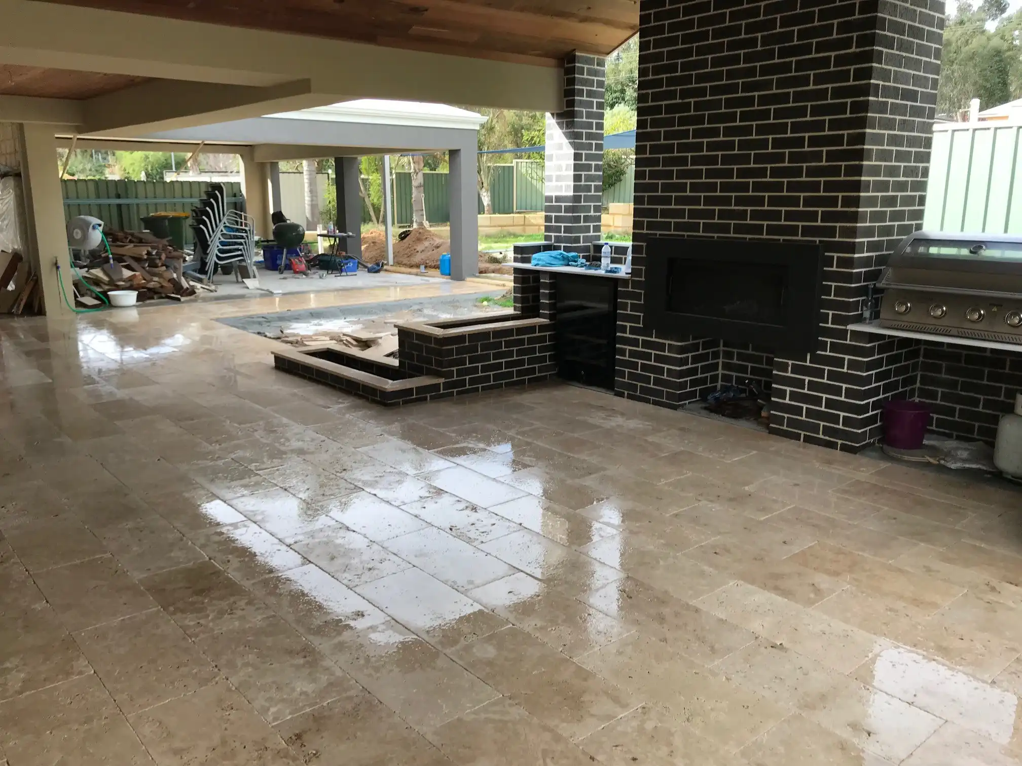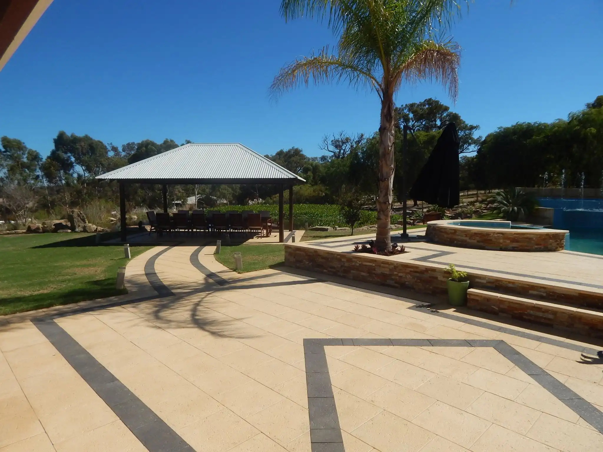 Jarrahwash and Roma Travertine Alfresco Paving with White Quartz Wall Cladding