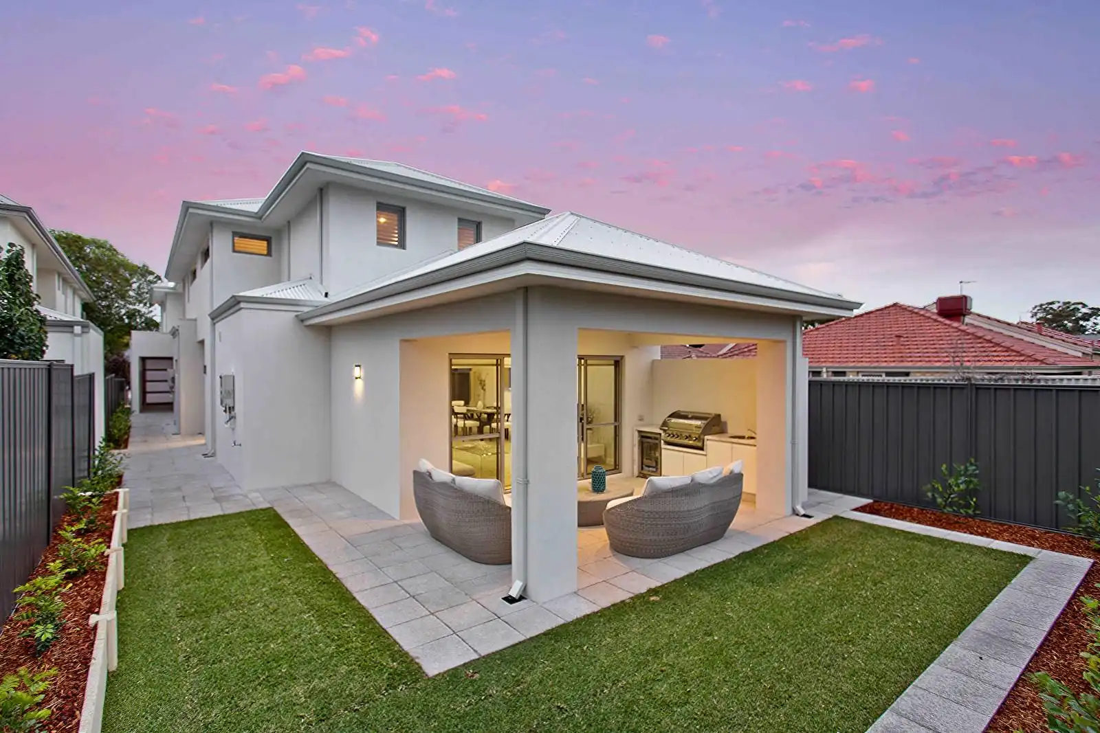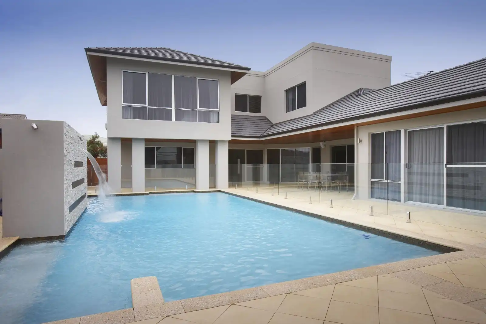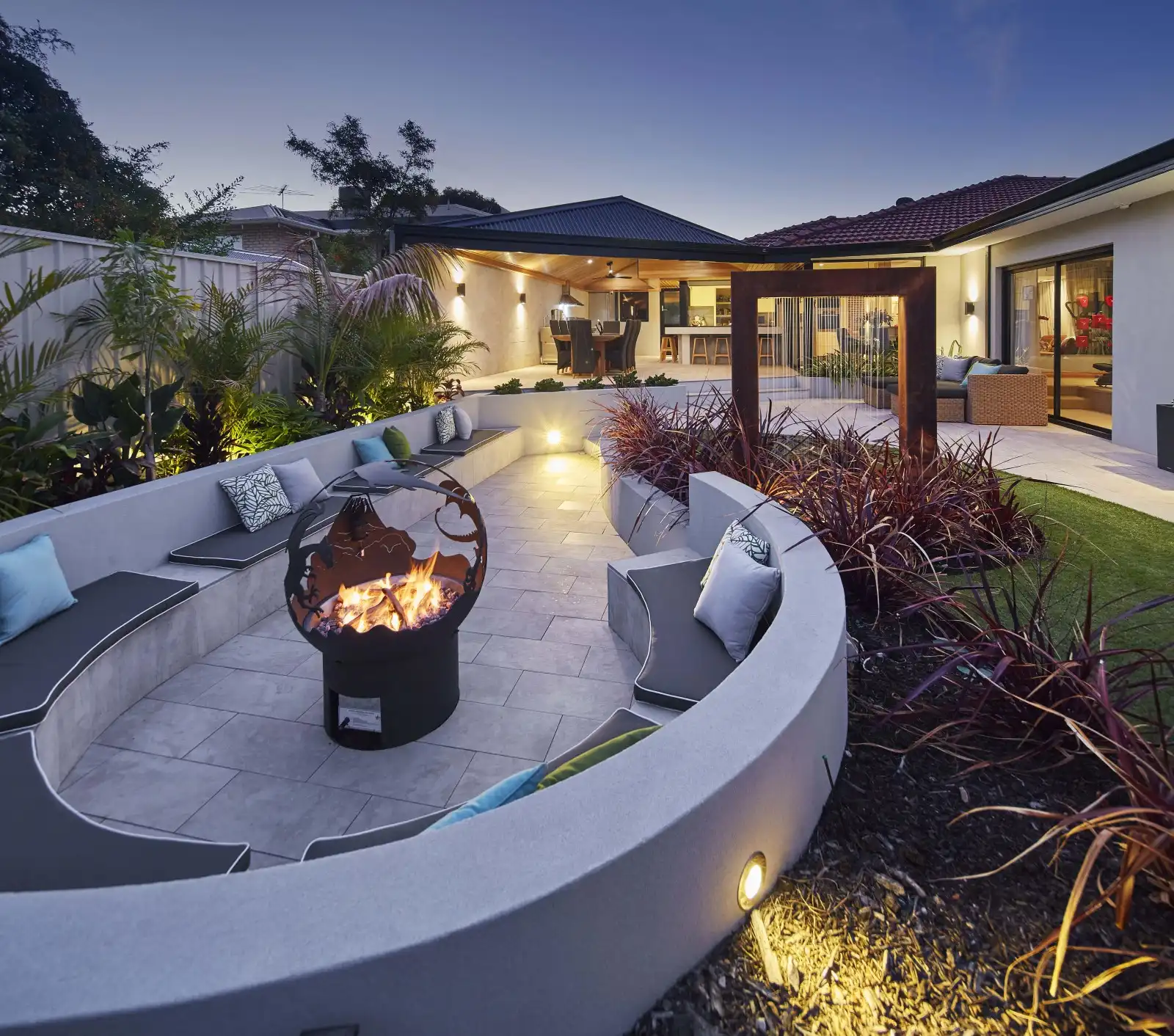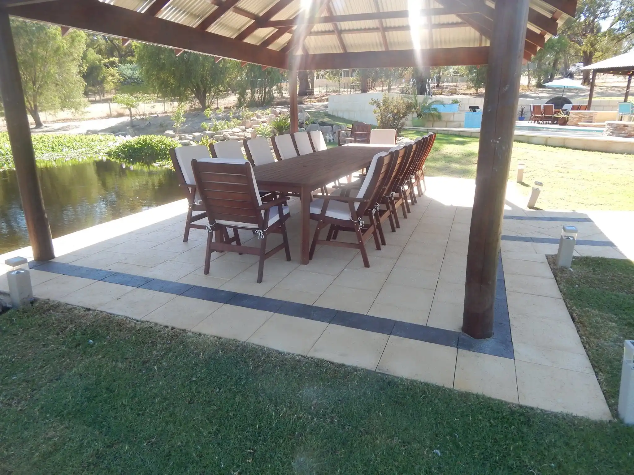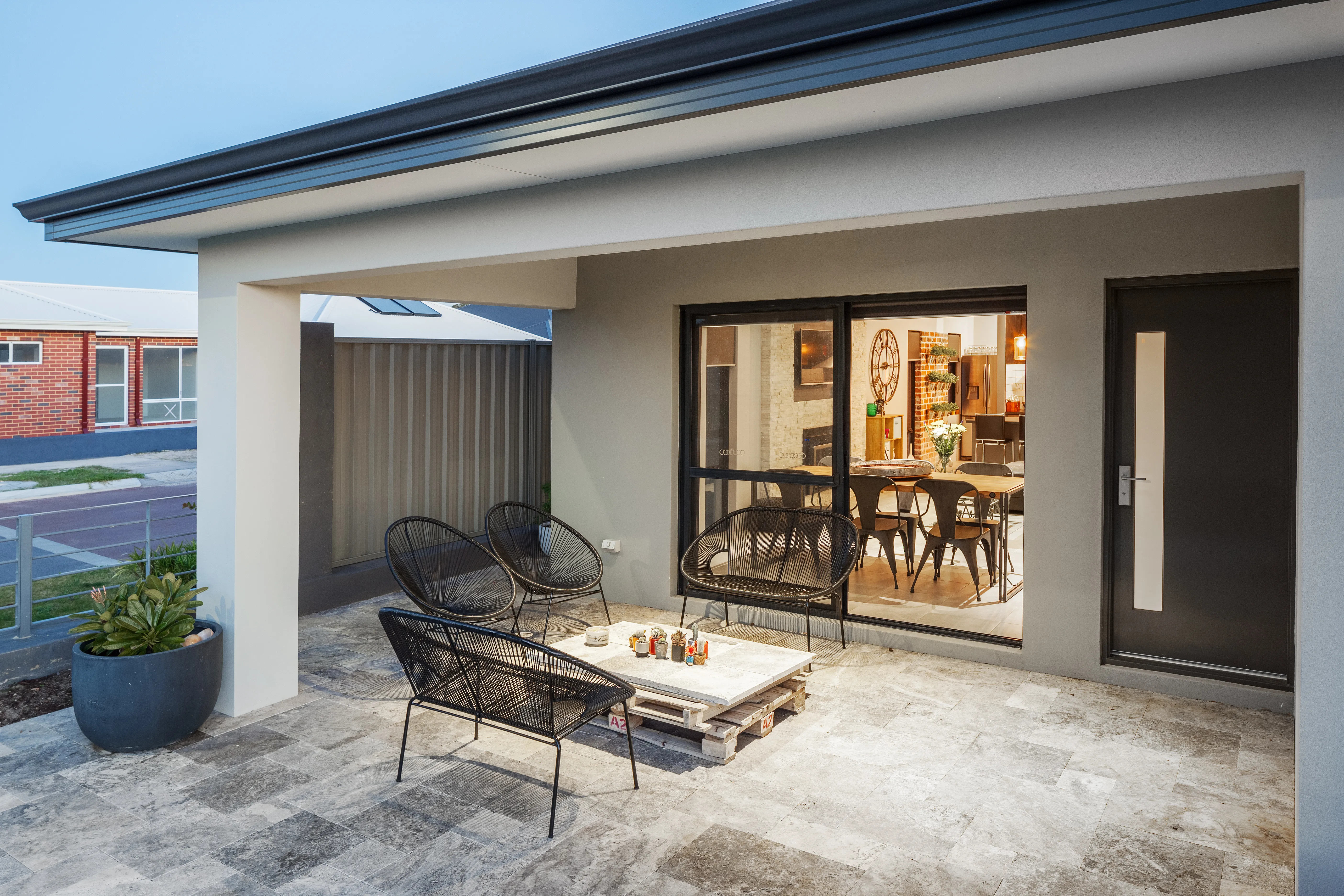 Jarrahwash and Roma Travertine Alfresco Paving with White Quartz Wall Cladding