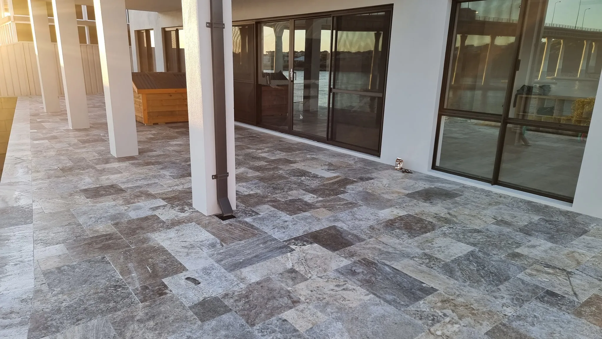 Next to concrete restraining of loose edges, join filling is one of the most important components of any paving project. Filling joins (the gaps between the stones) provides long term durability of your floorspace and help hold the paving firmly in place. Joins are never for drainage, all paving should be installed with a fall to ensure water runs away to various drainage points and is never allowed to puddle on the stone.